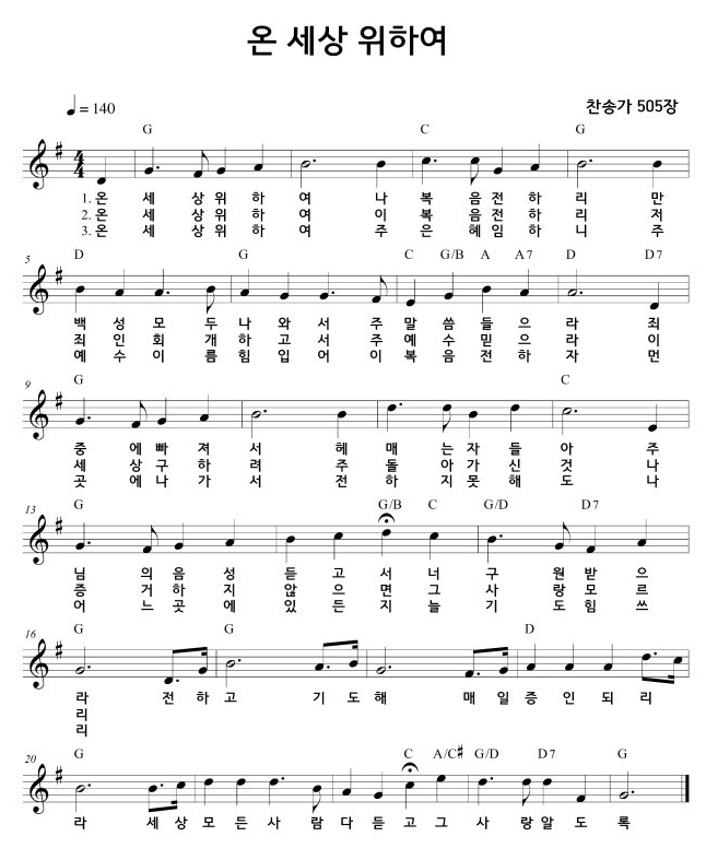 G코드 찬양 악보 / 온 세상 위하여 / 악보 / 가사 / PPT 다운로드