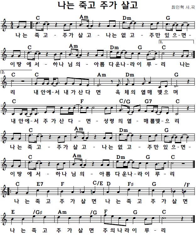 C코드 찬양 악보 / 나는 죽고 주가 살고 / 악보 / 가사 / PPT 다운로드