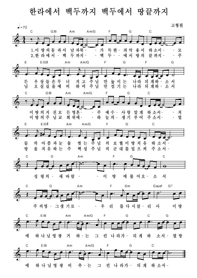 C코드 찬양 악보 / 이 땅의 동과서 남과 (한라에서 백두까지 백두에서 땅끝까지) / 악보 / 가사 / PPT 다운로드