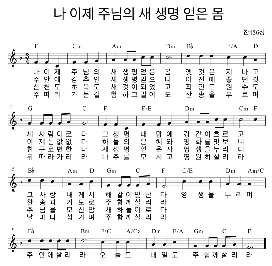 F코드 찬양 악보 / 나 이제 주님의 새 생명 얻은 몸 / 악보 / 가사 / PPT 다운로드