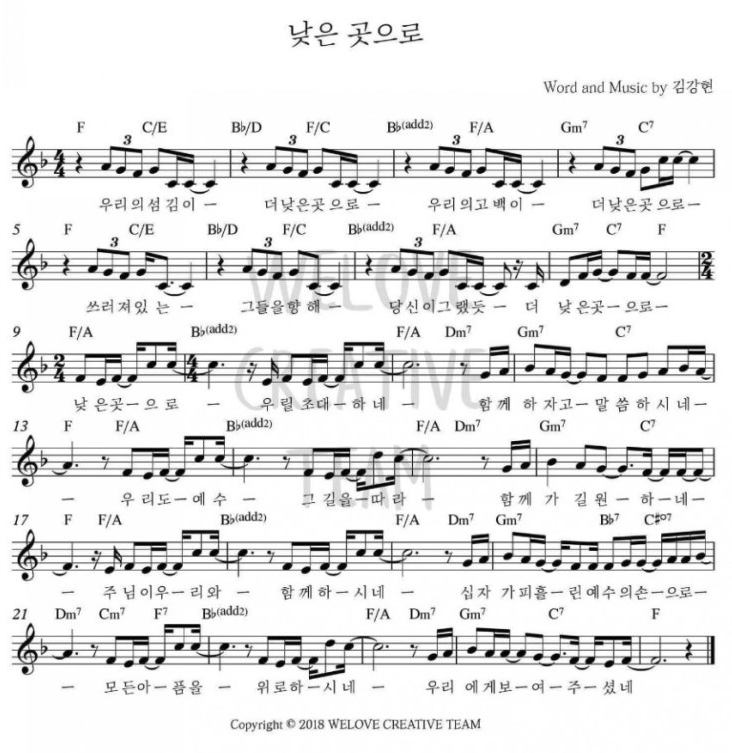 F코드 찬양 악보 / 낮은 곳으로 / 우리의 섬김이 / 악보 / 가사 / PPT 다운로드