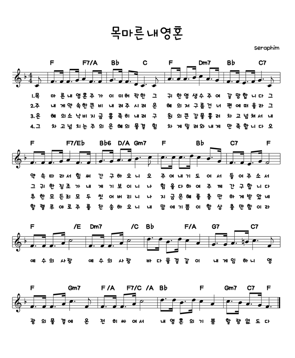 F코드 찬양 악보 / 목마른 내 영혼 / 악보 / 가사 / PPT 다운로드