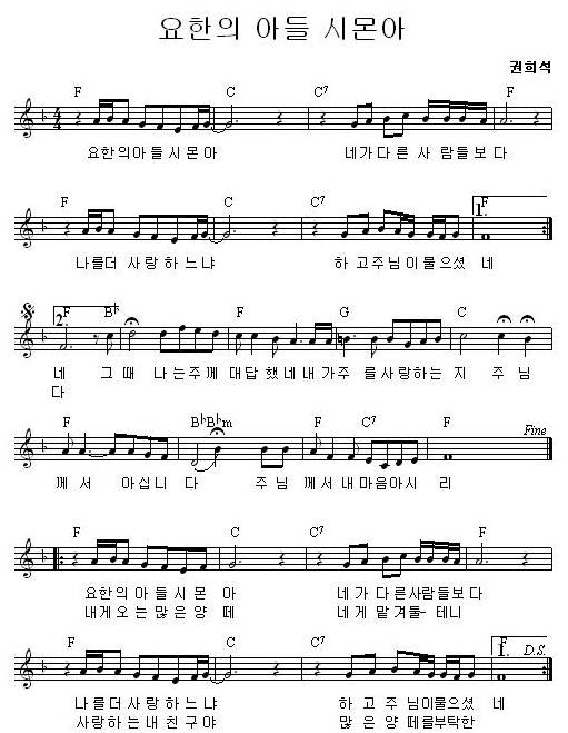 F코드 찬양 악보 / 요한의 아들 시몬아 / 악보 / 가사 / PPT 다운로드