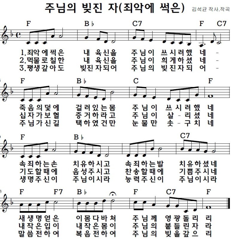 F코드 찬양 악보 / 주님의 빚진자 (죄악에 썩은) / 악보 / 가사 / PPT 다운로드