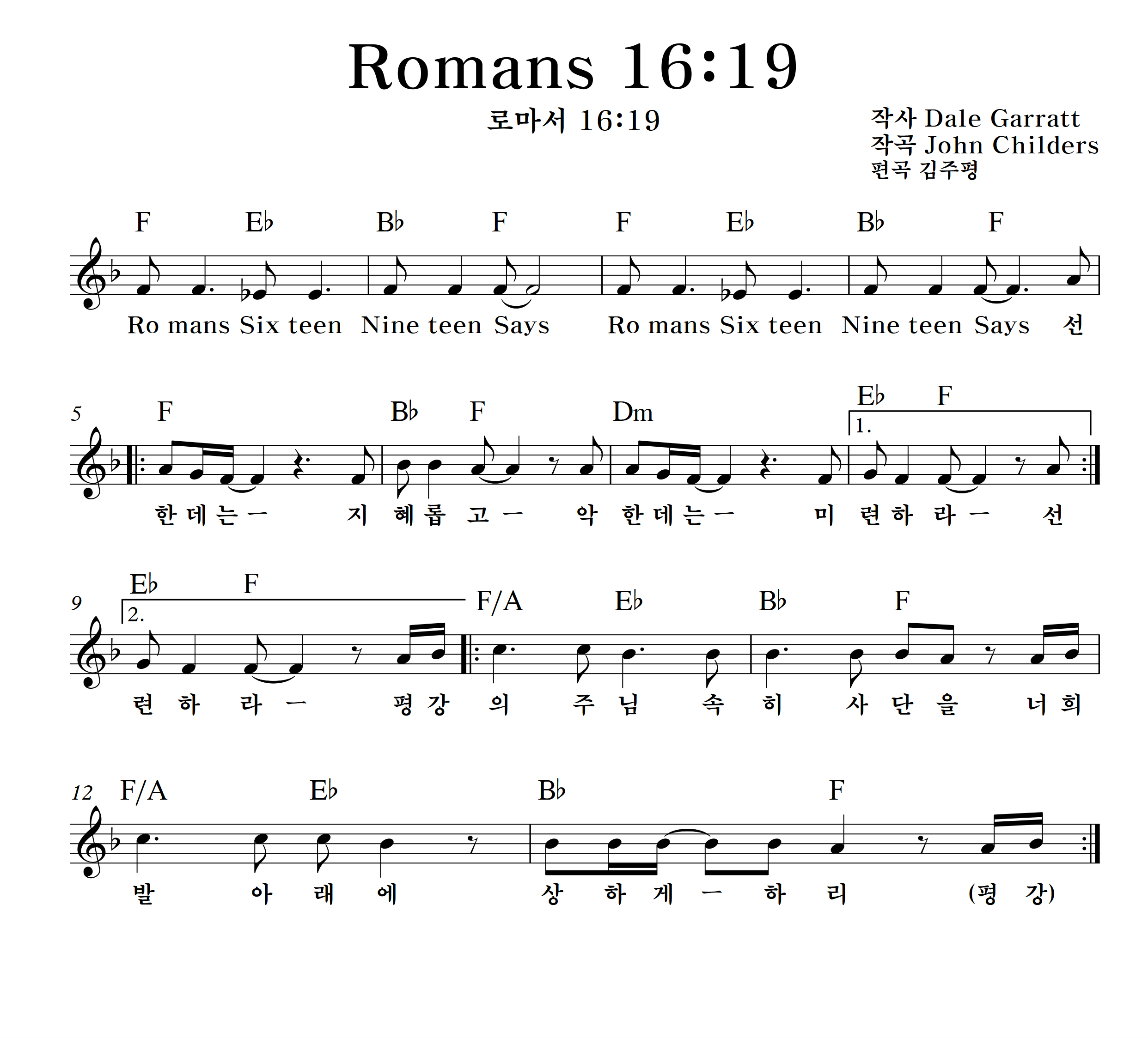 F코드 찬양 악보 / 로마서 16:19 / 선한데는 지혜롭고 악한데는 미련하라 / 악보 / 가사 / PPT 다운로드
